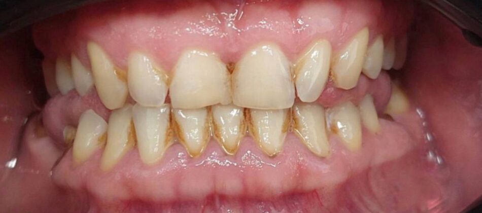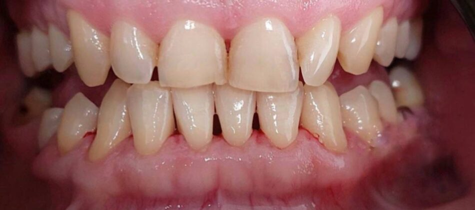 The patient is not satisfied with the appearance of her smile (wear, old fillings, discoloration of the teeth).