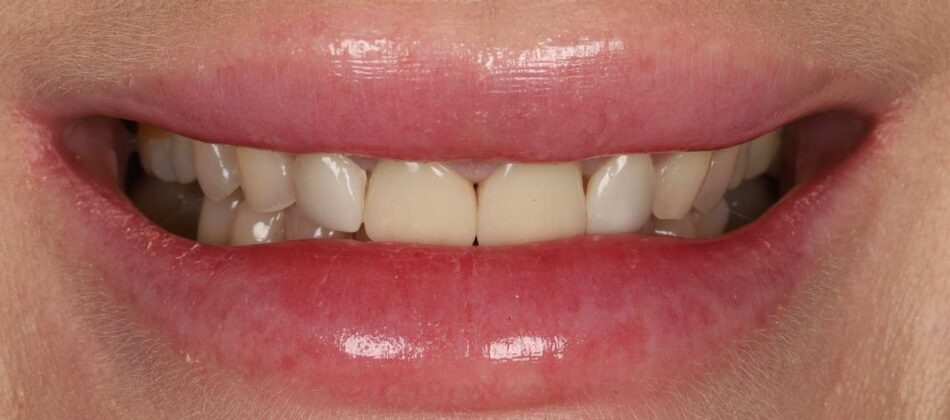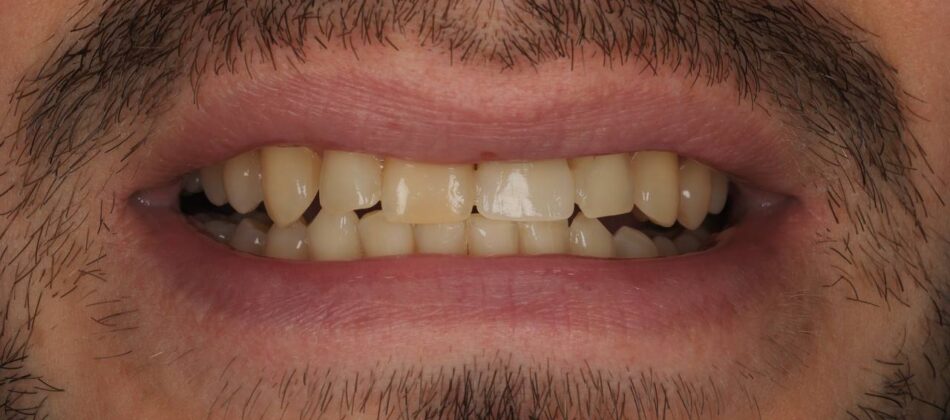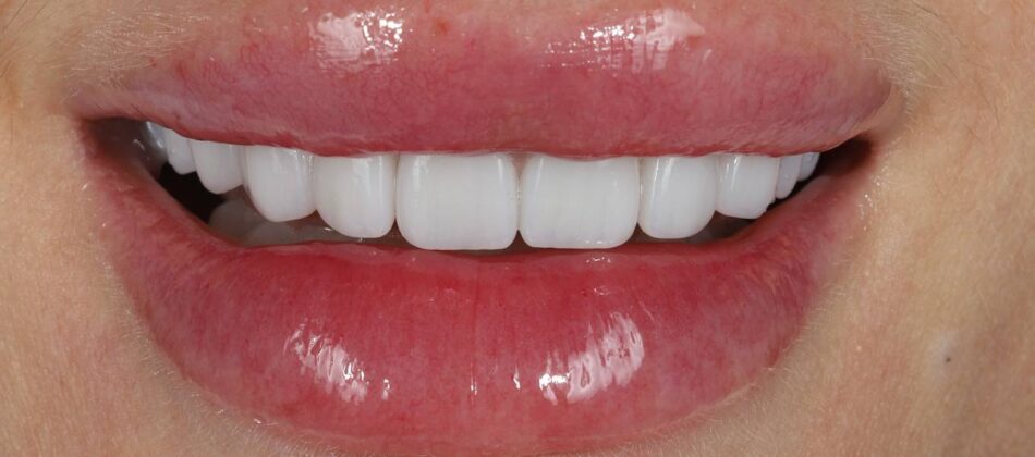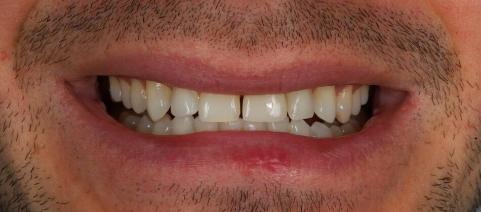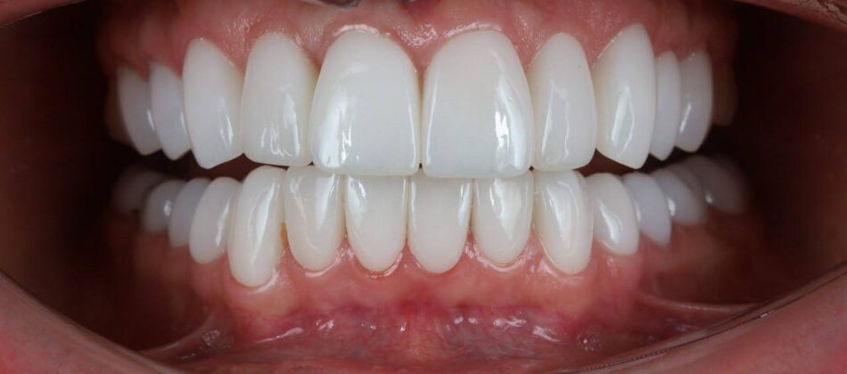 The smile was reconstructed with total prosthetics using zirconium dioxide crowns.